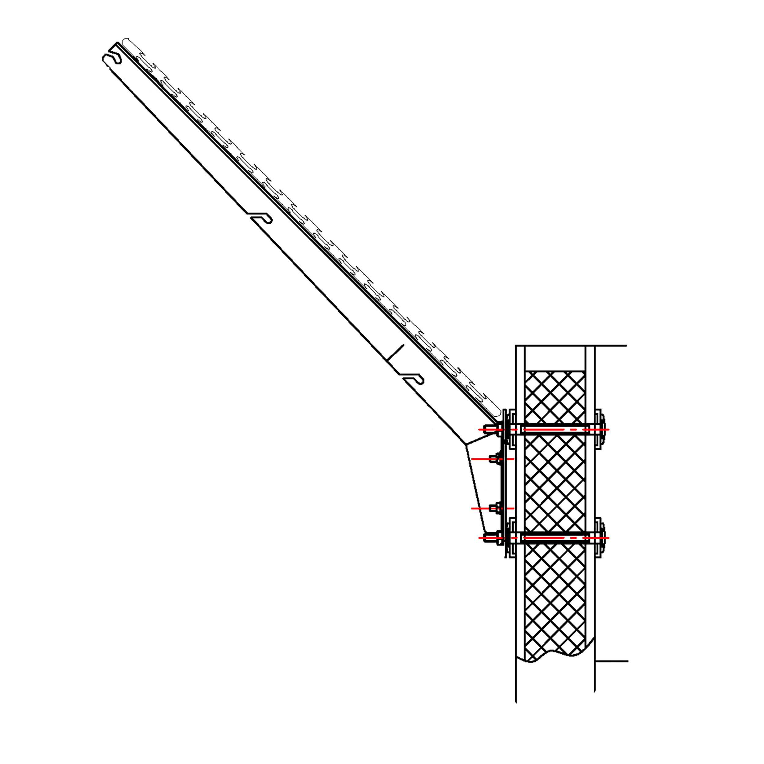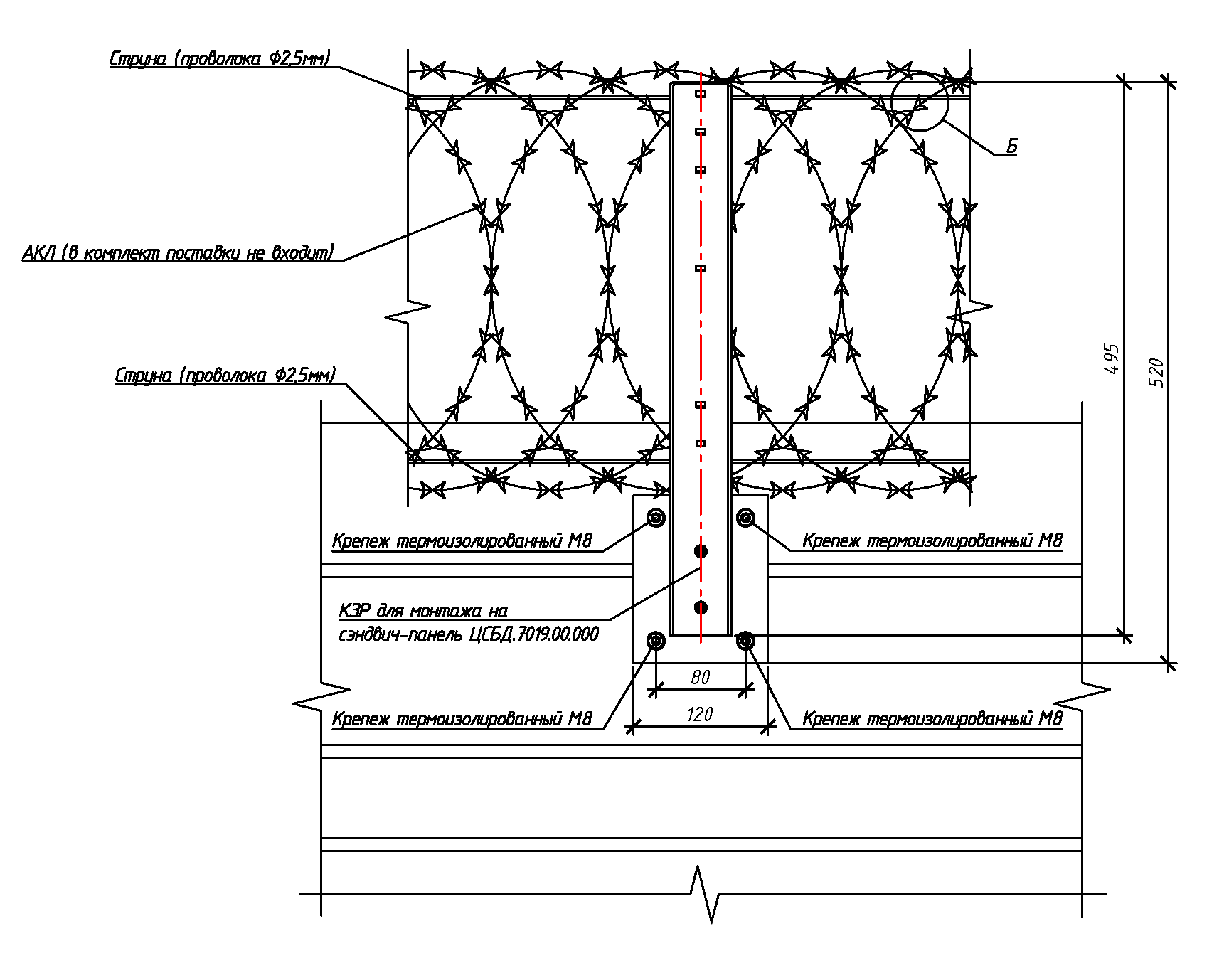 Изделие состоит из опорной плиты (для крепления на сэндвич-панель), стойки (кронштейна) и КМЧ, представляя L-образную конструкцию для крепления плоской или спиральной армированной колючей ленты диаметром 500мм, 600мм.