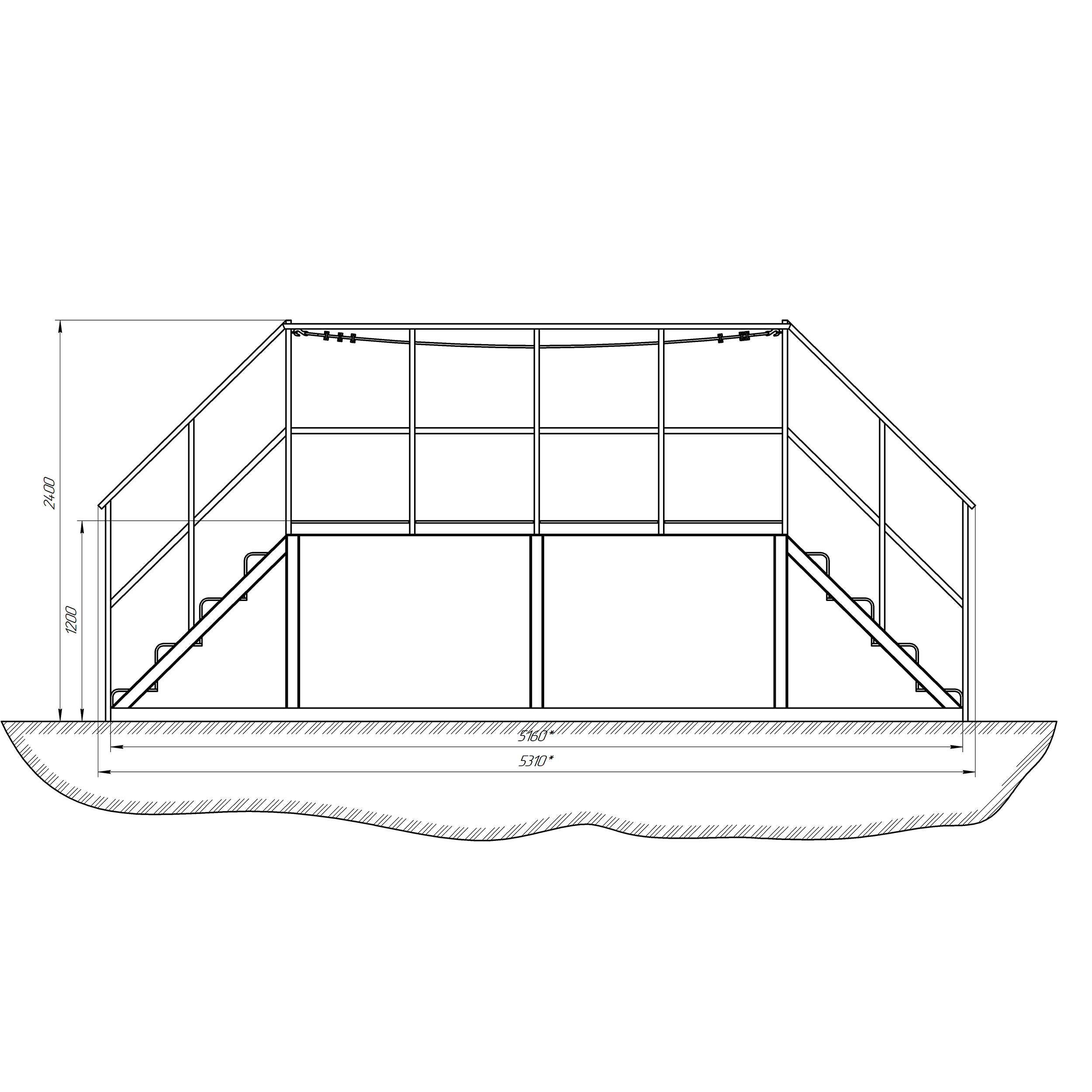Досмотровая эстакада ЦСБД.999.00.000 представляет собой площадку с перилами на опорных колоннах с лестничными маршами (двумя симметричными спусками/подъёмами) для размещения на пунктах контроля.